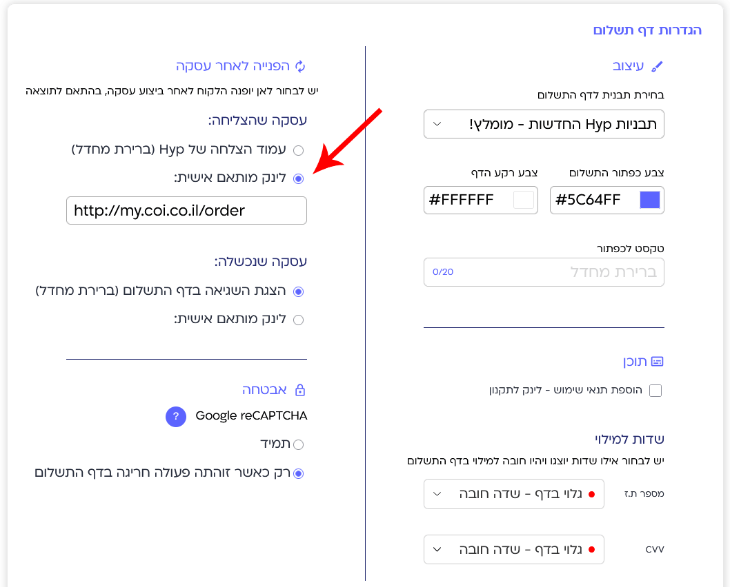 ביעד שריג בקובייה "הגדרות דף תשלום", יש להגדיר באפשרות: